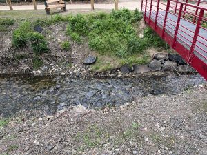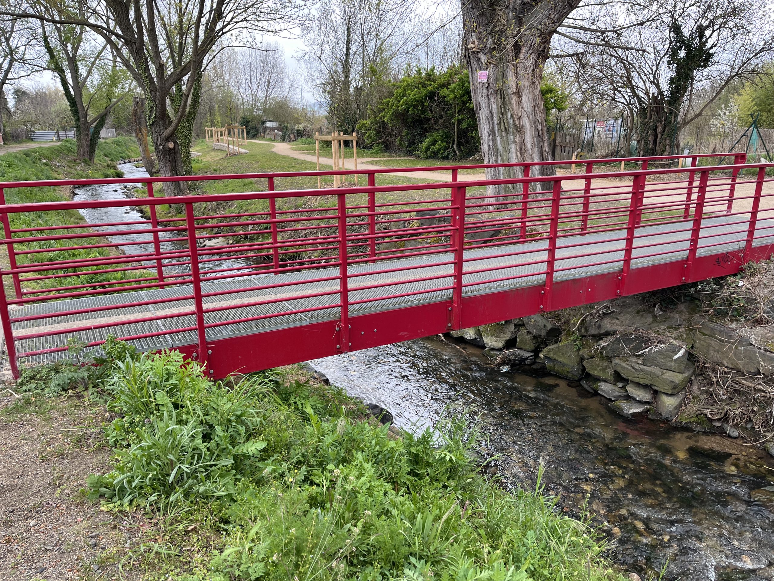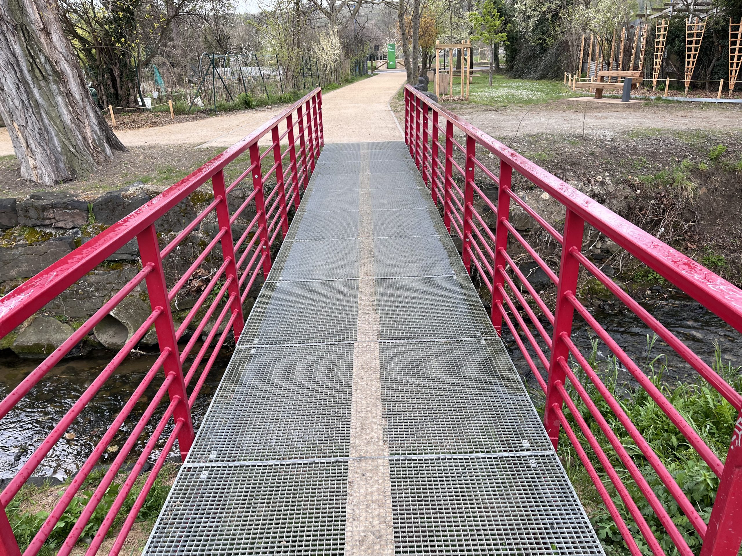 La passerelle piétonne située à mi-parcours permet de franchir la rivière.
